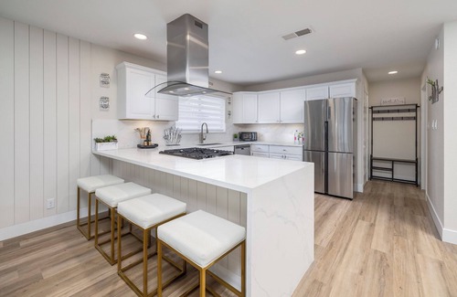 Exquisite Modern/Contemporary single story home with RV Parking minutes from Summerlin, Shopping, Trader Joes, Whole Foods, Sprouts, Parks and major freeways. Enjoy the solitude of this mature neighborhood in this completely remodeled property featuring a private front courtyard and large rear yard for your furry friends. Fully fenced property w/ tall privacy walls, covered patio, security gates, bbq, turf and mature landscaping. The kitchen is fully stocked for cooking, Nook w/4 barstools, Pantry, Coffee/Tea Bar, 2 Refrigerator/Freezers, dimmable recessed lighting and features quartz counter tops with waterfall & stainless steel farm sink. Grand dining room w/6 seat dining room table, electric fireplace, ship lap walls, exterior access to backyard and dimmable recessed lighting. Tile & Luxury Vinyl Planks thru-out, Shutters/Zebra Blinds, 65" Smart TV in Living Room w/ Electric Fireplace. All Bedrooms/Bath are fully equipped with towels/linens. Close proximity to the Strip, Red Rock, Mt Charleston and Downtown. If you are looking to relax and enjoy a clean & modern property centrally located this is your spot. The primary and secondary bedroom both have wall mounted TV's. Property has multiple ceilings fans, new AC, large laundry room and 2 car garage. The front courtyard is fully fenced w/ furniture, turf, flower bed and custom lighting. Enjoy the morning sun or afternoon shade while sipping your favorite beverage. This is a quiet, mature neighborhood and the property is designed for working from home or relaxing. Awesome property for RV & Dogs, the property is fully gated for your peace of mind. Home is professionally cleaned and has starter amenities with coffee/tea, dish soap, laundry soap, shampoo/conditioner, toothbrush, toilet paper & paper towels. The laundry room has an ironing board, ironing blanket and iron with a laundry basket. Each room is equipped with its own laundry basket and 3 sets of linens. Come enjoy the serenity this property offers.