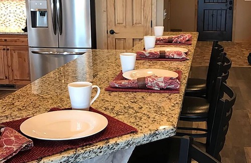 Located on the main entrance floor on each side is a large family room, a gas fireplace, and the most comfortable furniture you could imagine for watching the oversized LED Smart TV. The ultra-modern kitchen is perfect for large families with its spacious granite countertop breakfast bar. The kitchen has everything you need and is fully equipped with all upgraded cookware, a side-by-side refrigerator, a ceramic cook top stove & oven, and an over-the-range microwave. Our dining area has a CUSTOM DESIGNED solid wood table with matching seating for 20 that is situated to take advantage of the views of the lake. There are two queen bedrooms on this floor, each with an attached full bath. This is the perfect setup for a grandparent of loved one that does not want to do a lot of stairs. There is also a half bath on this floor.