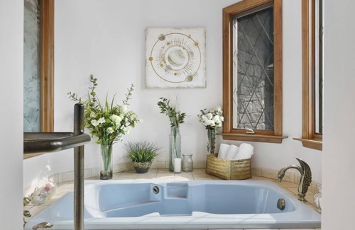 Outside, the estate offers even more wonders, from life-sized dragons and entertainment decks to firepits and breathtaking views- hiking trails, a scenic koi pond, waterfalls, gardens, and more. At the ridge's summit, you'll find a large firepit with ample seating, and firewood is provided. Conclude your day with a cozy bonfire and s'mores, or enjoy a glass of wine from the Juliet balcony.