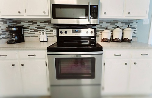 The kitchen is fully stocked with cookware, dishes, instant pot, air fryer, coffee pot, filters, coffee, toaster, ninja blender, and a large variety of spices. All you'll need is a recipe and ingredients that you can find right around the corner at our local Fresh Market store.