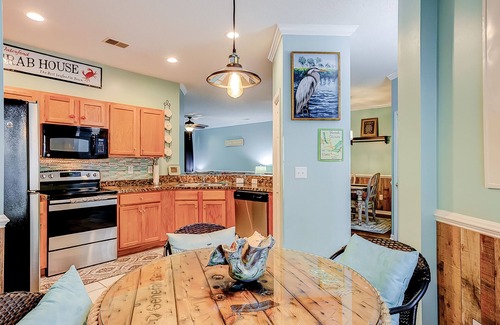 Overlooking the 17th fairway of Parkland Course at Legends Resort, this immaculate first-floor condo is your ticket to a relaxing getaway to Myrtle Beach. The two-bedroom layout features a bright, open floorplan designed for comfortable family gatherings. Coastal decor and color tones help you sink into a dreamy vacation mindset in no time. Enjoy morning coffee and afternoon cocktails on the fully screened porch while watching golfers play through. At-home meal planning is made easy in the fully equipped kitchen and there's plenty of seating between the eat-in nook, breakfast bar, and full dining table. After the day's adventures, unwind in the great room with shows and movies on the smart TV. Home essentials include central air-conditioning, free WiFi, and a private washer and dryer.