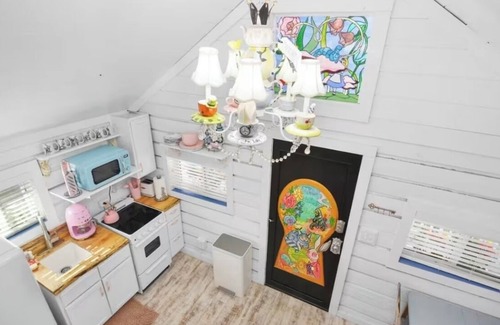 This charming cottage is nestled directly on the creek, offering a serene and whimsical escape from everyday life. As you cross a wooden bridge to the cottage, you’ll feel like you’ve stepped into a fairytale world. Alice’s White Bunny Cottage welcomes guests with delightful teapots and toadstools, setting the stage for a magical stay. Relax in the cozy interior, or enjoy the peaceful surroundings on the covered deck with a view of the creek.