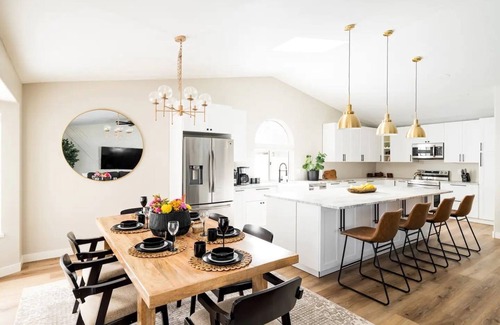 - Dining table seats 6 with an additional 4 counter stools at the island.