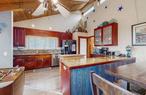 Whether you're planning a vacation with friends or family, this single-level home offers lovely ocean views and endless entertainment for guests of all ages. The nautical theme begins in the living room, which features soft leather furnishings and a wall of windows that face the water. After a scenic day of hiking on the Bluff Top Trail, return home to a flatscreen cable TV, DVD player, VCR, and a selection of VHS and DVD titles for quiet evenings in. More competitive guests will also find a foosball table in the living room, creating a fun and festive atmosphere at all times. Peer through the telescope to observe passing whales, deer, and foxes.