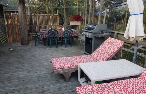 The screened in porch is a great place to people-watch while you eat and always has a cool breeze from the ocean in the evenings. The back deck offers a more secluded option to relax in the sun or enjoy a meal cooked on the propane grill.