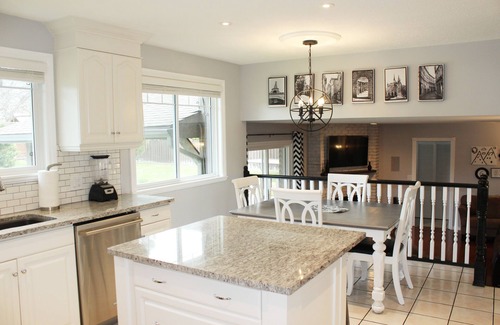 The backyard, which is every family’s dream for a rejuvenating and self-entertaining vacation, boasts a 16x36 foot (8-ft-deep) heated pool with a diving board (also a shallow end for beginner swimmers), a hammock, BBQ, flower garden, basketball net, street hockey nets, south-facing yard for maximum sunshine, covered back patio, and a deck and dining set for evening unwinding and relaxation.