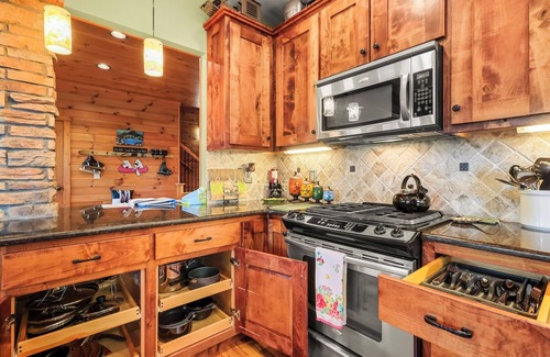 Our home has granite counter tops, stainless appliances, gas fireplace, beautiful wood throughout home, large deck and also a lower patio over looking mountains, a stone and wood covered entrance way. Satellite, internet, free wi-fi, home phone, and 5 HDTV's.