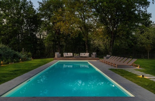 This elegant farmhouse villa provides an authentic Tuscan experience, offering six beautifully furnished bedrooms—five with double or king-size beds and one with two single beds—comfortably accommodating up to twelve guests. Fully air-conditioned and equipped with Wi-Fi, the property also includes a baby cot and high chair upon request. The villa maintains a no-pet, no-smoking, and no-party policy, making it ideal for families or mature groups seeking peace and relaxation. A private 18x5 meter pool, nestled among century-old oak trees, invites guests to unwind in total privacy and comfort. Set in the village of Orentano, the villa is ideally positioned to explore Tuscany’s most celebrated cultural sites. Pisa, Lucca, and Montecatini Terme are within a 30-minute drive, while Florence, San Gimignano, Siena, and the stunning Cinque Terre coastline can be reached in about an hour. The surrounding countryside is rich in vineyards, olive groves, and medieval villages, offering ample opportunities for scenic drives, food and wine tours, and historical exploration. The farmhouse features multiple living rooms, a fully equipped kitchen, a laundry room, and a beautifully restored lemon house converted into a large dining and living area. Guests can enjoy meals in the glazed poolside dining space or explore the villa’s lush grounds and woodland surroundings. The property includes a charging station for electric vehicles (available for a daily fee), outdoor surveillance for security, and all utilities, towels, linens, and final cleaning included in the rental. Note: Tourist tax to be paid at the property.