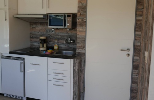 Your bungalow (40 m²) offers plenty of space for beautiful hours. Your cozy bedroom is equipped with a double bed (140x200). The dining area is complemented with a modern and fully equipped kitchen. In the open living area, the sofa bed (120x200) invites you to relax. In the cold season, a cozy evening with the firelight of the pellet stove is recommended. A TV is available, but due to weather there are often disturbances of the reception, so the TV is not listed in the equipment features.