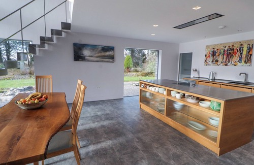 Fell End Cottage consists of a kitchen/diner with oven, induction hob, microwave, fridge/freezer, washing machine, dishwasher, and dining table, a sitting room with woodburning stove and TV, a study, a utility, and a cloakroom. The bedrooms consist of a mezzanine-floor king-size with en-suite walk-in shower, and two ground-floor doubles, serviced by a ground-floor bathroom. WC. WiFi, fuel, power, pack for woodburning stove, bed linen, and towels included in the rent. Outside, there is an enclosed wraparound garden with lawn, patio, furniture, and pond, an external walk-in shower, and an outdoor heated swimming pool, plus private driveway parking for four cars. Please note that this is a pet-free smoke-free property. Experience the wow factor of Fell End Cottage. Note: This property is not suitable for children under five due to the steel stairs and balcony. Note: A few steps down from kitchen/diner, please take care. Note: This property has a good housekeeping bond of 500 GBP. Please Note: A minimum stay of 4 nights is required for this property, with check-out restricted to Mondays.