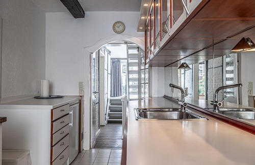 Lower floor: Here you will find the bright living and dining area, one of the two bedrooms and the fully equipped kitchen, which leads you directly to the sunny, covered terrace on the quiet Marienkirchplatz. The terrace is equipped with comfortable garden furniture - an ideal place to unwind with a coffee or a glass of wine.
