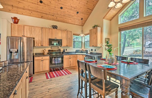 Immerse yourself among the pines at this tranquil woodsy Prescott vacation rental. Nestled on 4 acres of private land, this 2-story cabin retreat boasts 4 bedrooms, 3 bathrooms, forest views, a well-stocked kitchen, a sun-lit great room, a cozy living room, and king-sized beds. Try your luck at Bucky's Casino, spend the day at Goldwater Lake, or take your vacation to greater heights on Granite Mountain. Enjoy dinner al fresco then gather around the fire pit for storytelling and stargazing.