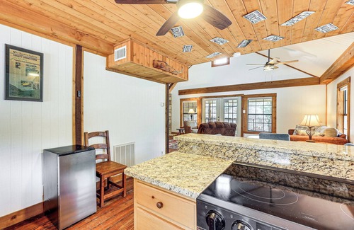 Escape from the hustle and bustle and soak in the sights at ‘The Overlook,’ a 1-bedroom + loft, 2-bath cabin in Tarpley, TX. This secluded and scenic vacation rental at Seven Canyons Ranch sits high over the Texas Hill Country with a rustic charm and lots of room to explore. Grill and eat dinner on the pavilion, stargaze by the fire pit, or cozy up near the warmth of the wood-burning stove.