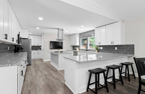 Thoughtfully updated from top to bottom, this modern ranch with a fully finished basement was made with entertaining in mind. The main level greets you with an open-concept living space where the kitchen, dining area, and living room flow seamlessly together. The fully stocked kitchen is a dream for home chefs, featuring all the tools you need to prep meals for the whole crew. While meals are cooking, guests can pull up a seat at the kitchen island, which offers seating for four and lake views to match.