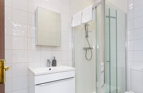 In the bathroom we have shower facility, washing basin, toilet, radiator and sensory lights.