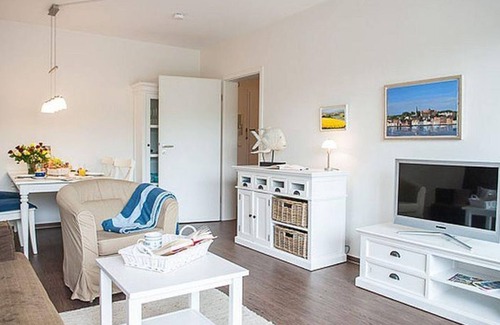 The centrally located 2-room apartment is 50 m² in size and is located in the 1st. Floor of a quiet apartment building. There is a lift that allows you to easily reach the 1st. Reach the floor. The apartment is maritime and fully furnished and has a balcony facing the courtyard in north-west orientation. A cozy living room with dining area, a bedroom, a kitchenette and a bathroom with shower complete the overall impression. The city center, various shops, the swimming pool and the train station are within easy walking distance. Walk for about 10 minutes and you will come to the harbor top with many restaurants, bars and ferry piers.