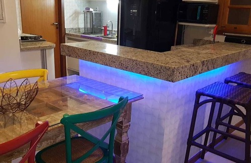KITCHEN: 422 L Brastemp Active Inverse frost free refrigerator, black (release) / 4-burner Brastemp Active cooker, with oven and hood FOGATTI (Italian) / sandwich maker / microwave / blender / purifier Consul with cold and natural water / dishes , pans, glasses, and full utensils for 8 people / L-counter with two high stools.