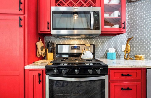 The kitchen dazzles with pops of red, stainless-steel appliances, and granite countertops—a fully stocked space perfect for whipping up anything from snacks to full feasts. Enjoy meals at the high-top table inside or dine al fresco on the private deck.
