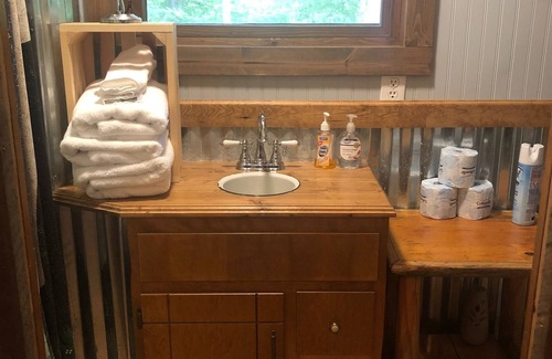 A cozy, one-room cabin with a private bathroom with a shower. You can relax and enjoy our private woods while sitting on the side deck.