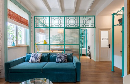 This apartment is efficiently designed with bright colors and a cozy sitting area with a comfortable, large couch. The three large windows allow plenty of sunlight. The screen roller door provides bedroom comfort and privacy. There is an AC unit for hot Tbilisi summers and an electrical heating system for winter. A comfortable wooden work desk is there for you to work remotely. You are right off of Liberty Square, the city's most central spot.