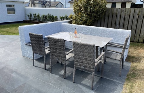 Holiday home in Rhosneigr, Anglesey, North Wales. Sleeps 8, 4 bedrooms. A fabulous modern family home, which has undergone a full refurbishment to a very high standard. Located on Whispering Sands - a fantastic location 2 minutes walk to both beaches and the village centre. South/west facing garden perfect for the afternoon sun and relaxing over a bbq and a fine glass of wine! Sea views - simply breath taking. The property has been refurbished to a very high standard and comprising 4 bedrooms (sleeping up to 8 people) - ideally arranged to suit a mix a families. Two bathrooms - one on each floor - both have walk in showers. Outdoor water hose to wash down wetsuits. Gas fired central heating. Sitting room with large L shaped sofa and a wood burning stove and a selection of books. Lovely sun room/dining area over looking garden and patio. Modern kitchen/diner with all the usual appliances including large fridge/freezer and double oven. Dining table in both the kitchen and sun room.