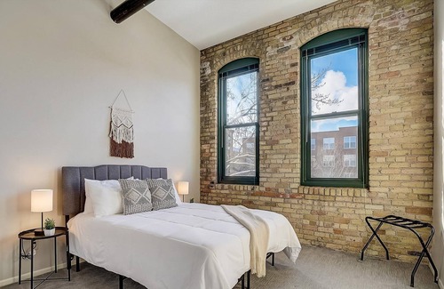 Our spacious two-bedroom suite features modern amenities like soaring ceilings, quartz countertops, and central air conditioning. This suite has carefully maintained a piece of the warehouses historic past by highlighting its original brick and timber work. The kitchen is adorned with stainless steel appliances, a Keurig coffee maker, and basic cookware to cook simple meals for a cozy night in! There is even free Wifi!