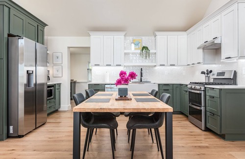After entering through the multipurpose entry room with full-size laundry and golf bag storage, the house opens up to an inviting kitchen & great room area where you and your guests can enjoy the lake view through a wall of windows. Chat it up over dinner at the butcher block kitchen table that seats up to 8 guests or plop down in the comfortable living room area with seating for 4 to 6 guests. Four cozy bedrooms for up to 8 guests surround the great room and feature large desks and king-sized beds with ample space to store all your luggage below.