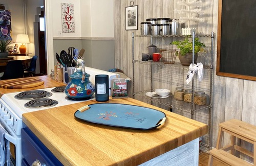 Sleeping Dogs Inn is a wonderful home decorated in the spirit where mid-century design meets a modern vibe. It is fun to browse and experience the tasteful art and endless detail that is in every room. This home fills the senses far more than a picture can depict. A bright and cheery kitchen welcomes you each morning where the smell of coffee and home cooked meals are yours for the making. Two charming bedrooms a top the staircase feature cozy and comfortable full and queen beds. A restful sleep beckons you. The open main floor combines living and dining areas. The 2 sofas fold out for additional sleeping options. In the summer months the large backyard offers outdoor entertaining with ample seating on the deck.