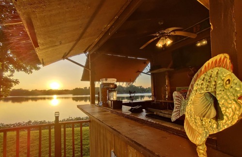 Bring your whole family or friends group out to this secluded waterfront resort in nature, surrounded by the lake! Watch the sunset over the water while you enjoy the outdoor area that includes a sprawling granite kitchen and high-top bar complete with propane grill, hot stove eye, a Big Green Egg, and bring your marshmallows for the propane fire pit. Take the provided kayak out onto the lake or cast a line (also provided, BYOB) from one of the many over-water structures. Plunge into the lakeside pool (seasonally available ~April - ~September) with the poolside Tiki Bar, or soak in the hot tub (seasonally available ~September - ~April). Relax, recharge, and unplug at this gem of a location!