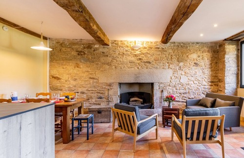 A rustic gîte, the living room and kitchen stay cool in summer and winter. In the cold season, the Porte des moines gîte is preferable.