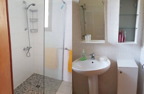 Walk-in shower, washbasin, ample storage space, hairdryer, towel rack, laundry basket