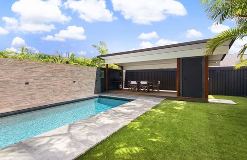 The first-floor features cool-polished concrete floors, with an open plan entertaining area, that spills out to the freshwater naked pool. Throughout the house, the furnishings are comfortable and tasteful. The modern kitchen has high-end appliances and is perfect for entertaining friends and family. Out the back, you'll find a private backyard, the stunning pool and an undercover BBQ dining area.