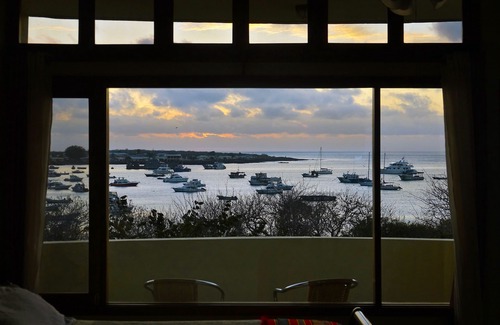 The Bonito Suite faces west, for gorgeous sunsets over the port of Puerto Baquerizo Moreno and Shipwreck Bay on San Cristobal Island. Bonito is on the (raised) first level of the second phase of Casa de Huespedes: Jardin de Helena (Helena's Garden).