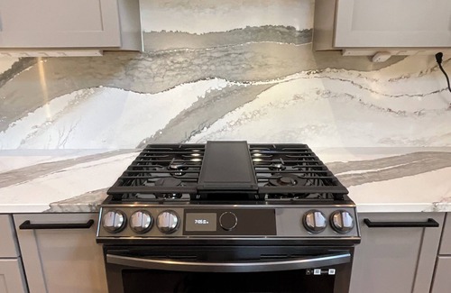 Each bedroom has its own name and theme. The master bedroom downstairs is “Beach Vibe” and is a tribute to our love of the ocean and world travels to amazing beaches and scuba dive adventures. The master bathroom has twin backlit mirrors that resemble full moons on the black tile wall to guide the young sea turtles back to sea. :)