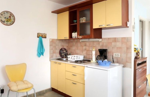 2-room house 33 m2. Living/dining room with 1 double sofabed and satellite TV (flat screen), air conditioning. 1 room with 1 french bed (160 cm). Open kitchen (2 hot plates, toaster, kettle, freezer, electric coffee machine). Shower/WC. No heating option. Terrace partly roofed. Terrace furniture, barbecue (portable), deck chairs (2). Beautiful view of the sea. Facilities: Internet (WiFi, free). Please note: non-smoking house. Max. occupancy: 2 adults, 2 children up to 12 years old.