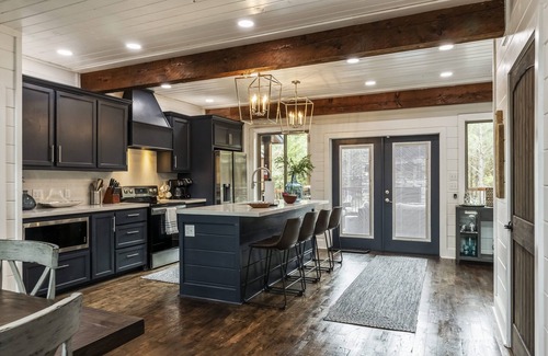 Downstairs consists of the cozy family room with a beautiful stone fireplace, leather couch, and two glider rockers. Watch your favorite shows on the 55” Smart TV while waiting for dinner to cook in the modern kitchen. The open floor plan features a cook’s kitchen with an oversized island and quartz countertops. There are also stainless-steel appliances and plenty of cookware to make your favorite meals. There is ample amount of seating for all your family and friends at the dining table that seats 6, even 8 with the seating bench. At the island there is comfortable leather seating for 4 providing the opportunity to visit while preparing meals. Next to the kitchen is a walk-in pantry, laundry room with stackable washer and dryer, as well as another half bathroom.
