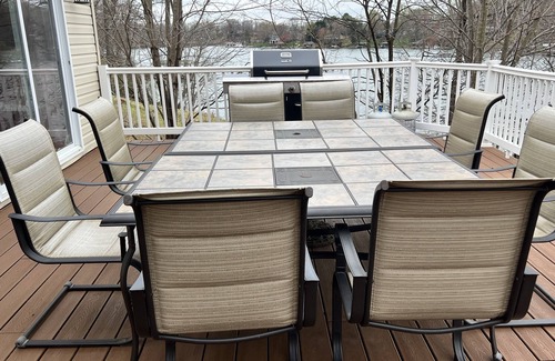 Outside, it only gets better! This is what you come to the lake for! Huge new deck with plenty of seating and a large grilling area. The deck has expansive views of the cove and beautiful sunsets. There is a gentle slope to the dock that even the grandparents can do, with a pathway the whole way. There is a covered seating area at the dock, a floater with plenty of room to tie off a boat, and DEEP water. The dock is nestled just inside a no wake area, making it great for swimming and kayaking. There is an outdoor firepit with comfy new adirondack chairs. Also, new for 2021, we have removed the wooden pathway to the lake and replaced it with a concrete pathway!