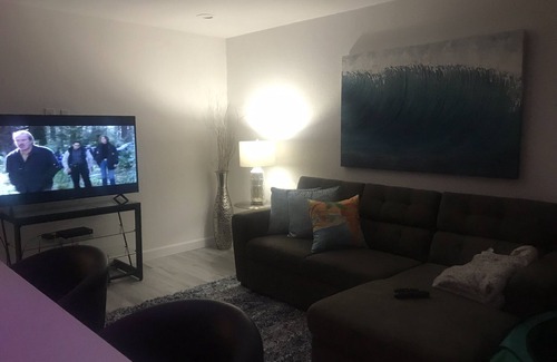 The open floor plan in the living room area has a brand new Kitchen and bar area with center Island. Dining room table/ office area with a 60 in TV. The bedroom is large with King bed and TV with cable and wifi ready.