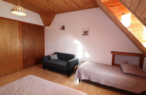 You have a terrace and a small open plot of land with garden furniture and barbecue. On the first level, dining room with fireplace (free wood insert) and flat screen TV, kitchen area, living room, bathroom, separate toilet. Upstairs, 1 bedroom with 1 double bed, 1 bedroom with 1 double bed and 1 single bed, bathroom with toilet. Electric heating included. Prices all charges included.