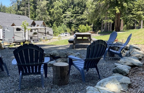 The site has a park like setting and is surrounded by large Redwood, Cedar, and Fir trees in addition to a seasonal creek. Included is your own private outdoor dining space that includes a large stone fire pit and picnic area that is perfect for lounging during the day or staying warm by the fire at night. Help yourself to FREE firewood for the firepit and upon request we have S’more sticks as well as everything you need to make a delicious S’more. The unit comes complete with all linens, kitchenware for cooking and even some basic cooking ingredients and common items found in a fridge. Also included is a Traeger Wood Fire Grill for your use. This location is a great base to explore the North Coast! Enjoy