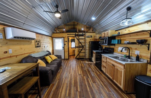 With two inviting bedrooms, including a comfortable Queen bedroom and a fun bunk bed room, this cabin accommodates up to eight guests. The open living area is perfect for gathering, featuring a Queen pullout couch for additional sleeping space. Enjoy the convenience of a well-equipped kitchen, complete with cooking basics, a coffee maker, and a dining area where you can savor meals together.