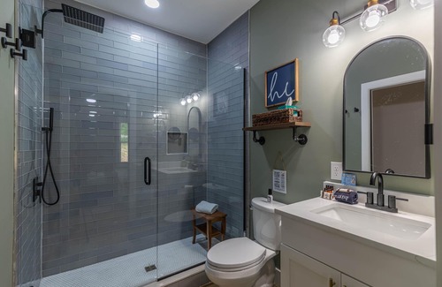 The main level has two bedrooms. The primary bedroom has a spacious room with king sized bed, high ceilings, and a private TV. The attached bathroom has a gorgeous tiled shower with body sprayers. The second bedroom is a queen bed with TV. The second full bathroom opens to both this bed and also the hallway. Upstairs is the enclosed loft with a minisplit for additional comfort. The third bedroom is a queen with TV. Guests of this room share the second full bathroom on the main level.