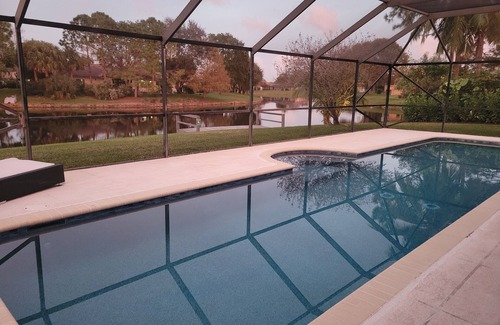 Relax in this recently updated waterfront, 3 bedroom home with private heated pool and dock just minutes to the Palm Beach International Equestrian Center. It is a little piece of heaven and guests have loved. It's less than 2 miles to the horse show via golf cart or bike and less than 2 miles by car or cart to the Adequan Global Dressage and Derby fields. Or if Polo is your preference we are less than 10 minutes to the National Polo Club. After a day of equestrian activities, or golf, or fishing, come home to the expansive pool area with tranquil views to the lagoon. The large master suite has a private bath and patio doors that open to the pool area. The queen and twin bedrooms share a full bath. The open floor plan makes for easy living with a natural flow between kitchen, living and dining room. The office alcove is perfect for remote working in Florida's beautiful climate. The house is just a short distance to a Publix supermarket, Starbucks and Dunkin, a pharmacy, hardware store, dry cleaning and dining so you never have to travel far. Wellington has many great restaurants to explore and they deliver. The horse show features "Saturday Night Lights" with some of the world's top show jumpers and hunters under the lights in the International Arena. If you rent a golf cart, it will be an easy in and out for all the activities at WEF. If you want to venture further, Palm Beach and the Atlantic Coast is only 30 minutes. Palm Beach international airport is only 25 minutes away so flying in and out couldn't be easier! Boating, fishing and golf are all nearby. Lion Country Safari is a fun adventure for the kids. We are located in a quiet neighborhood with many year round residents. We will be continuing to improve the house over the next few months with some added windows, window treatments, more furniture and improved landscaping. As the upgrades continue, we will add new photos. Dogs are welcome under 50 lbs, no puppies. Dogs must be preapproved. We may have more dates available than are shown on the calendar so ask us. Long term off season rental may also be available at a reduced rate. Our caretaker, will let you into the house. He is just a short distance away if you need anything. We were a premier host for years in Vermont and always got 5 star reviews. We will be working hard to make this a special little gem in Wellington! Because this is our vacation retreat too, we want it to be as nice for us as it is for you. Discounts for longer stays. Ask the owner.