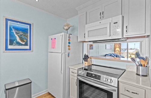 Please enjoy your stay at our condo which has had many updates for the 2024 season. Upgrades include new sliding door and windows, new couch, leather chair and rug, remodeled bathrooms including newly tiled showers and top-quality glass shower doors, new Smart TV in the living room, new range in the kitchen, complete exterior rehab including new siding, paint, and pool refurbishment. Located in the perfect location just steps to the beach, boardwalk, bars, restaurants, and nightlife. Take in beautiful Ocean views, watch the sunset over the canal, and watch the Thursday night fireworks at the boardwalk right from the deck.