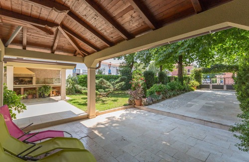 In the beautiful town of Svetvincenat, known for the historical Grimani Fortress, this nicely furnished vacation apartment is located on the first floor of a family house, which is the ideal setting for a wonderful vacation. The owners live on the opposite side of the house, so guests have plenty of privacy. A large terrace adorns the house, as well as the well-kept garden with cypress trees. In the evening you can taste a glass of local wine and enjoy the view of the fortress, where numerous cultural and entertainment events are held in the summer, not to be missed.