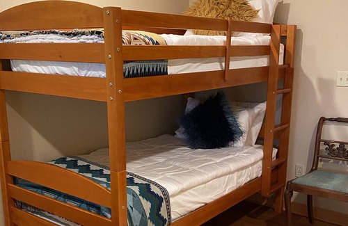 Gorgeous, eco-lodge guest-house on the bottom floor of a stunning log cabin, nestled in the woods on 20 acres. This spacious, downstairs studio has a private entrance and all the amenities needed for a comfortable stay, including central heat and air, laundry and wifi. This is one of the few properties that is fully equipped with all solar, well-water and a generator to power the entire property during power outages. We are located in Sierra Springs, 3.5 miles from Lake Jenkinson.