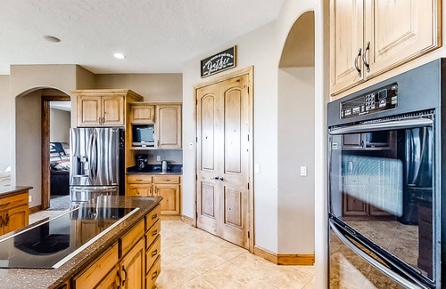 This two-level home, located in Cedar City, UT, is as beautiful as it is enormous, and it is just the place your family has been waiting to find for your next desert vacation! You'll have seven bedrooms, four bathrooms, two half-baths, and enough space to comfortably accommodate up to 24 people, so this is definitely the ideal place for your family reunions or big get-togethers with friends. Inside, you'll find a gigantic living space filled with lots of natural light, comfortable furniture, and every luxury you could think of. The living room is open and spacious, with vaulted ceilings, a gas fireplace, and beautiful valley views through grand wall-to-wall windows. Head into the dining room, and you'll find a handsome table with seating for 12, sparkling floors, and a door exiting to one of the upper balconies where you'll find plenty of patio furniture to enjoy 180-degree views and a refreshing cocktail on. The gourmet kitchen is a volume of amenities all by itself: from a breakfast bar with seating for seven and a center prep island with an inlaid range to the stainless steel appliances, lustrous wood cabinetry, and a dry goods pantry, this kitchen is the family chef's dream-come-true!