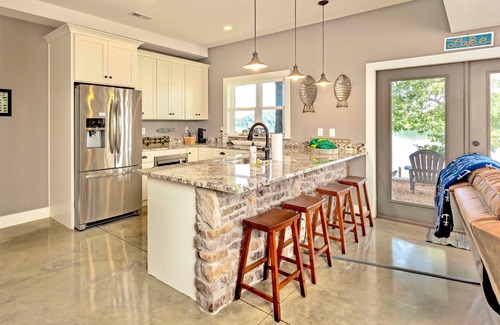 The Hideaway boasts a grassy yard along the water with tons of different spaces to enjoy the absolutely stunning landscapes. Directly on the water, our boat house and dock offers seating for lounging in the sun between dips in the refreshing lake. As the evening arrives, get cozy on the upper-level deck where you’ll have the perfect view for a sunset over the water. Whether you enjoy fishing, boating, water skiing, or simply taking in stunning views, take advantage of your unlimited access to the water. This property is certainly one-of-a-kind and ensures that you'll have a memorable getaway experience. The garage is accessible through the kitchen and has a ping pong table and corn hole boards.