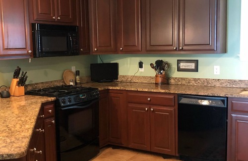 Very well equipped beautiful kitchen with granite and gas stove and grill.