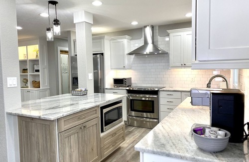 KITCHEN: Well-equipped w/ cooking basics as well as blender, hand mixer, crock pot, drip and K-cup coffeemaker, toaster oven, microwave, and dishwasher. Dish soap and dishwasher tabs are provided.